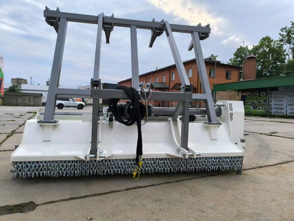 Лесной и парковый мульчер 1JL-200 – оборудование для срезания кустарника и деревьев на корню, измельчения остатков в мульчу, в том числе и на больших площадях. Предварительная валка, вырезка деревьев и кустов не требуется. Также не требуется и вывоз измельченного материала, т.к. он перемешивается с землёй и в дальнейшем перегнивает. Агрегат приспособлен для работ по поверхности грунта, без заглубления в почву. Общие характеристики: Общая ширина – 2180 мм Ширина захвата – 2000 мм Количество ремней — 4 шт. Тип рабочего органа — молоток Диаметр измельчаемой поросли – до 15 см Скорость вращения рабочего вала – 2125 оборотов в минуту Скорость вращения вала отбора мощности – 540-1000 оборотов в минуту Диаметр рабочего вала – 170 мм Расстояние от центра редуктора: — до левого края – 102 см — до правого края – 98 см Вес – ~960 кг Минимальная мощность трактора – 75 л.с.