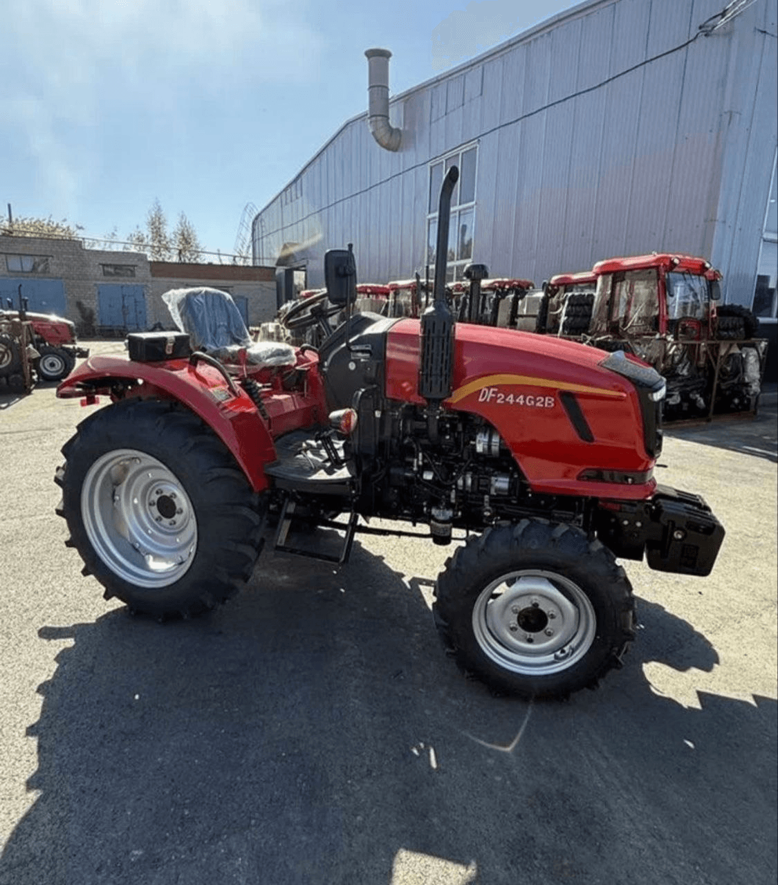 Тракторы Dongfeng (Донгфенг)- это самые качественные сельскохозяйственные машины, производимые в Китае. Тракторы DF производятся в КНР фабрикой Changzhou Dongfeng Agricultural Machinery Group. Трактор Dongfeng DF-244 G2 — универсальная машина для ведения сельского и коммунального хозяйства, которая обладает целым комплексом преимуществ: начиная с довольно надежного двигателя, заканчивая наличием реверса и возможностью подключать дополнительное навесное оборудование. Основное преимущество, которым обладает минитрактор Dongfeng DF 244 G2 — цена. Она относительно невысока и довольно выгодна в сравнении с аналогичными тракторами корейского и японского производства. Однако это вовсе не показатель сомнительного качества. Напротив — компания Донфенг предлагает одновременно бюджетные и эффективные варианты для малых частных и коммунальных хозяйств. Трактор Dongfeng DF-244 G2 оснащен гидроусилителем руля, что обеспечивает легкость управления. Масса трактора в сухом виде (без масел, топлива и охлаждающей жидкости) составляет 1340 кг. Трактор с 2 парами гидровыходов, счётчком моточасов, улучшенным пружинным сиденьем Характеристики Мощность, л/с: 24 Тип двигателя: Дизельный Количество цилиндров: 3 Номинальный расход топлива, г/ кВт. Час: ≤255 Максимальный крутящий момент, Нм: ≥96.8 Тип сцепления: Сухое, двойное Реверс КПП (8+8) ВОМ, об/мин: 540/1000 Размер шлицевого соединения: 6-зубьев Колесная формула: 4x4, полный привод Размер задних колес, мм: 11.2-24 Размер передних колес, мм: 6,50 - 16 Гидроусилитель руля (ГУР): есть 2 пары гидровыходов: есть Габаритные размеры, мм: 3450 х 1550 х 2350 Колесная база, мм: 1710 Колея передней оси, мм: 1200 Колея задней оси, мм: 1200 Дорожный просвет, мм: 358 Масса: 1340