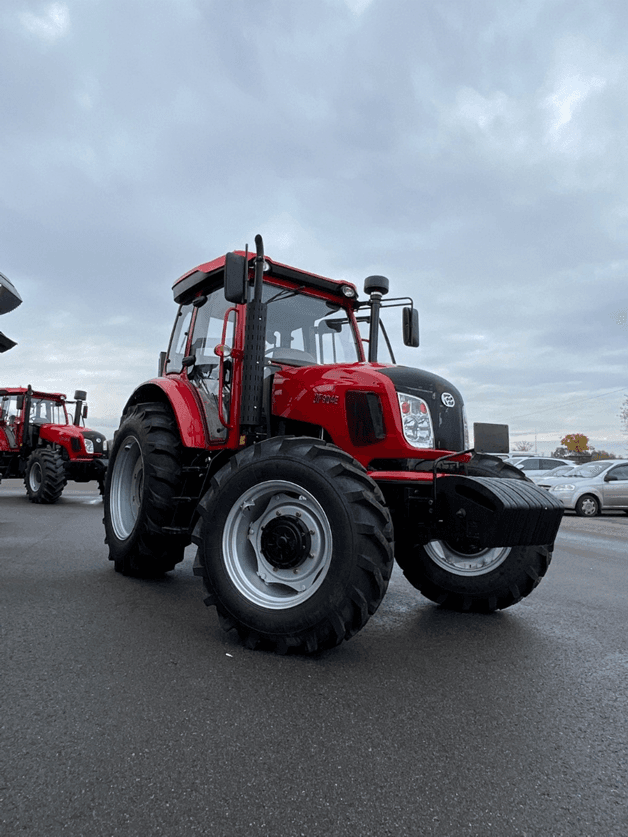 Трактор Донгфенг 904 – один из главных конкурентов белорусскому МТЗ-82.1. Почему? Да потому что лучше! Под капотом у DF904 находится 4х цилиндровый турбодизель LR4M5-T67Y2-U2 с экологическим стандартом StageII. Техника относится к тяговому классу 1.4. Мощность 90 л/с (66.2 кВт). Номинальная частота вращения 2300 об/мин. Рабочий объем 5,13 л. Максимальный крутящий момент 348,7 Н*м. Удельный расход топлива при номинальной мощности ~242 г/кВт*ч. Коэффициент запаса крутящего момента ~20%. Емкость топливного бака 152 литра. Трансмиссия трактора Dongfeng DF904 На тракторе установлена механическая нереверсивная коробка переключения передач. Число передач: 12 вперед, 4 назад. Скорость движения DF904 1,8-33 вперед и 4,5-14,9 назад. Муфта сцепления LUK – сухая двухдисковая. Задний вал отбор мощности независимый двухскоростной 6- пазовый шлицевой. Скорость вращения ВОМа 540/1000 об/мин. Система тормозов пневмо- механическая. Характеристики: Мощность, л.с.: 90 Дорожный просвет, мм: 330 Размер задних колес: 16,9" x 34" Размер передних колес: 13.6" x 24" Вес, кг: 4700 Колесная формула: 4x4 Тип тормозной системы: Пневматический дисковый тормоз, раздельный для каждого колеса Тип сцепления: Двухдисковое двухступенчатое, сухое, с постоянным зацеплением Тип гидравлического распределителя: Штатный распределитель для трехточечного подвеса Система света: Дальний и ближний свет | Поворотники |Габаритные огни | Стоп-сигнал | Подсветка заднего подвеса Звуковой сигнал: Клаксон Датчики на приборной панели: Комбинированная приборная панель: Вольтметр | Датчик температуры охлаждающей жидкости | Датчик давления масла | Счетчик моточасов | Уровень топлива Гидроусилитель руля (ГУР): Есть Наличие кабины: да